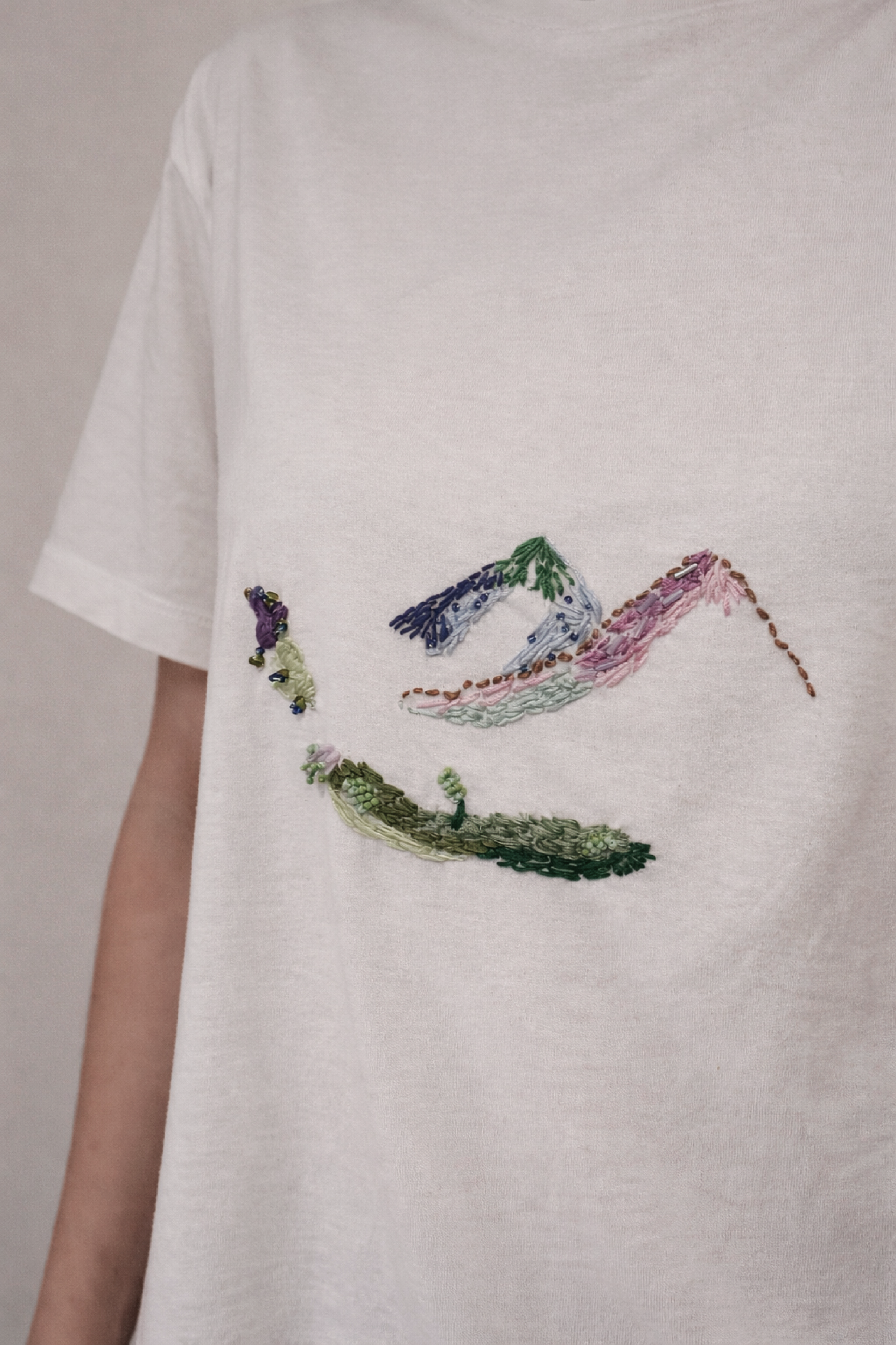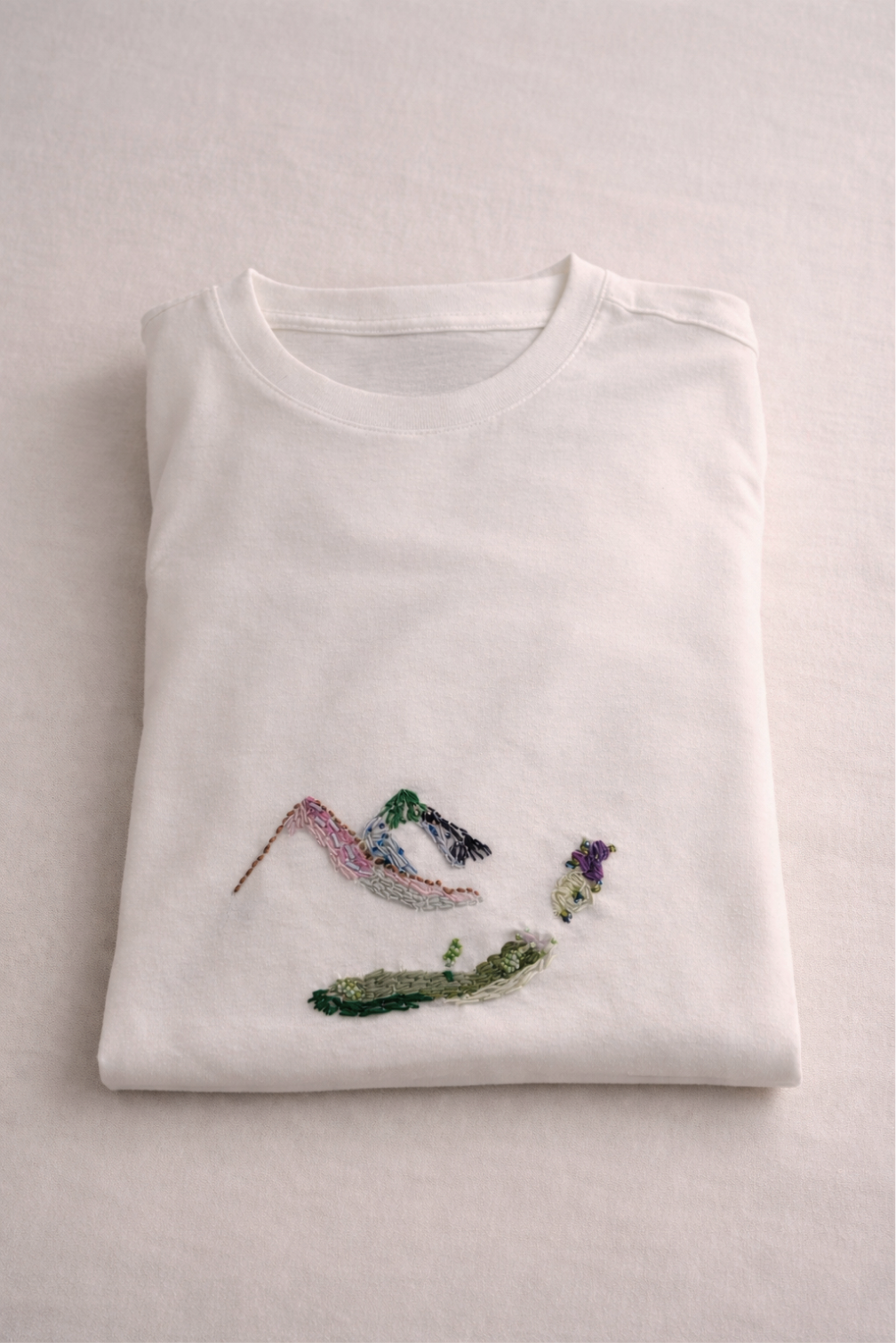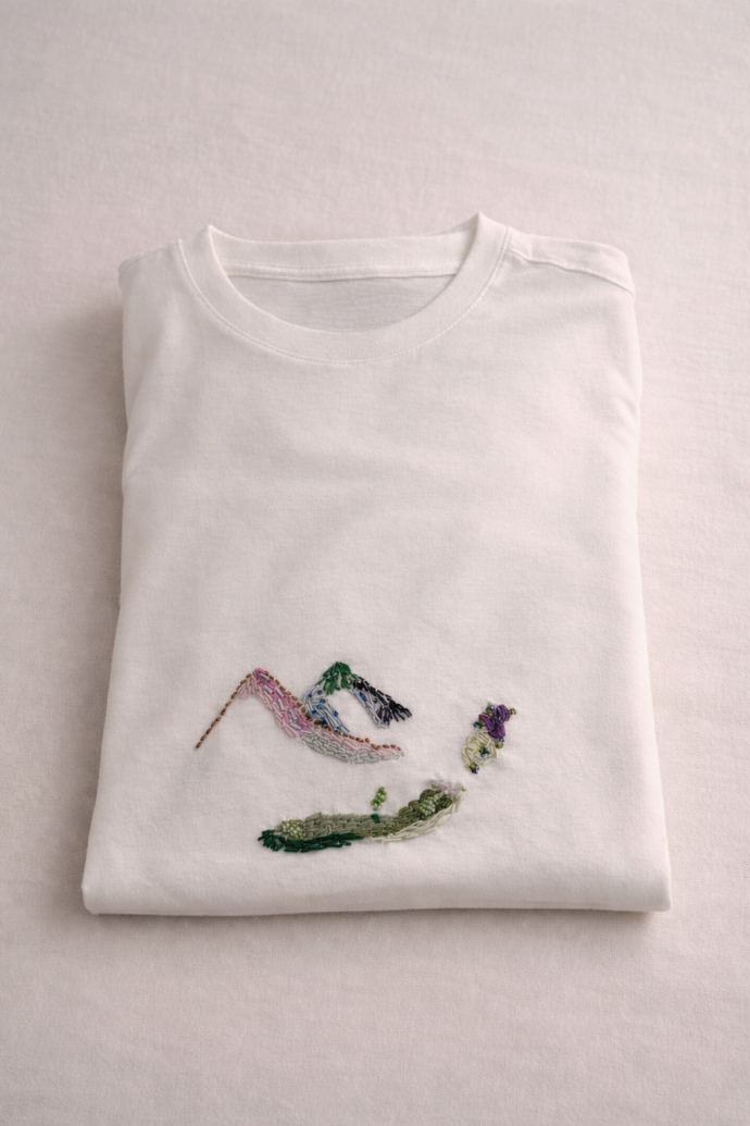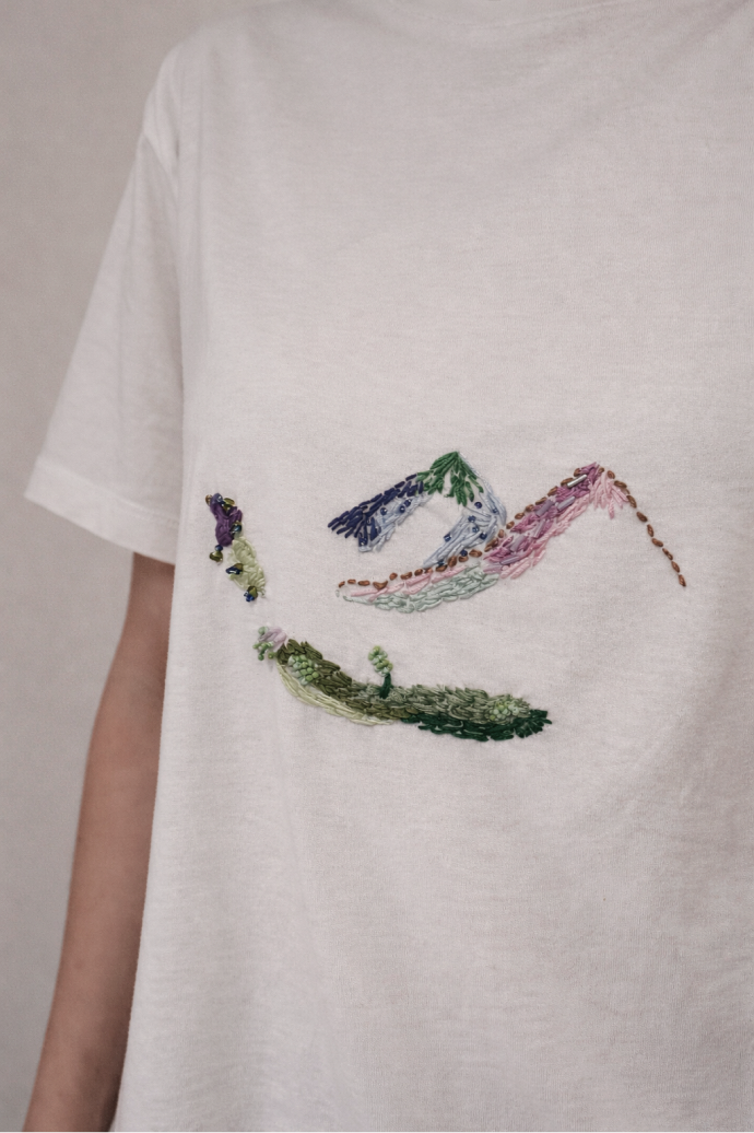 This tshirt was a creation made for a loved one. Her intention was to represent nature from a dreamlike perspective, something like a surreal place, a space where one breathes fresh air, finds inspiration, and where things are colorful. Something like a small paradise hidden somewhere in the world we live in, completed by what we choose to see in it.